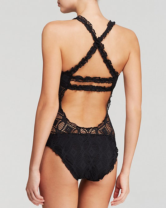 Badgley Mischka Swimwear Gisele Shirred Mio One Piece Macrame Swimsuit Size Small