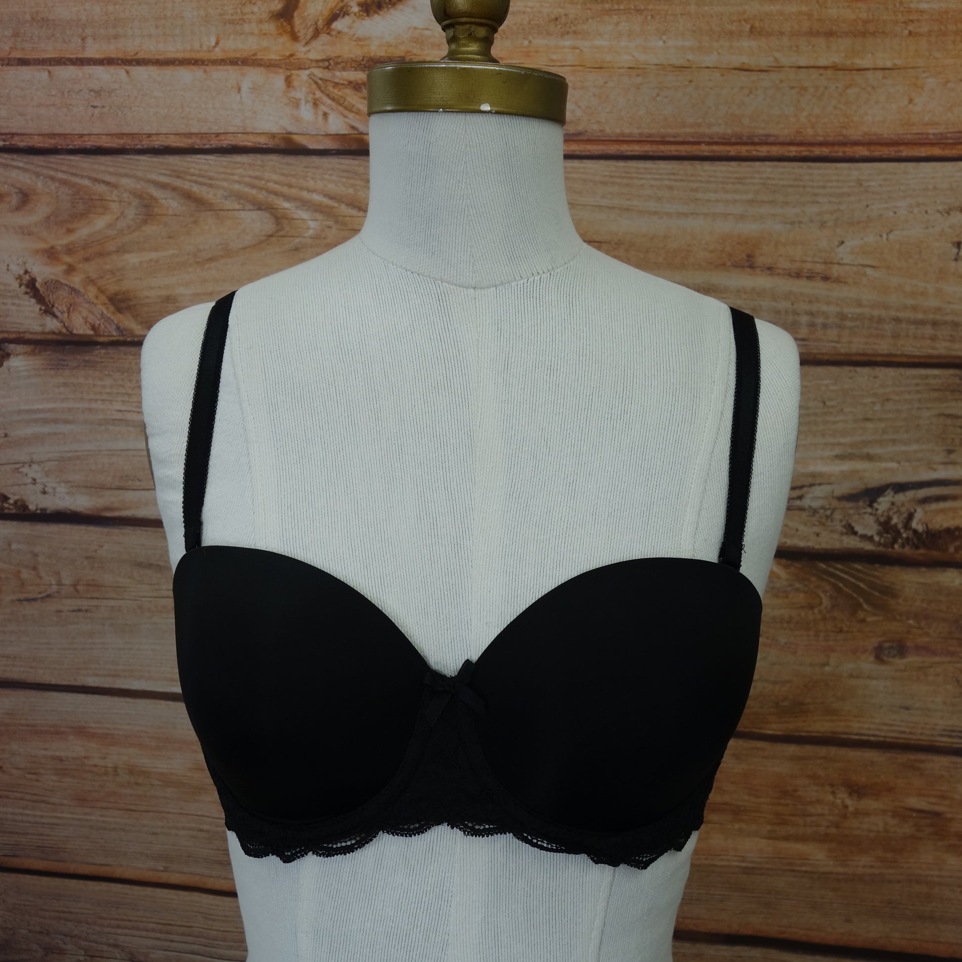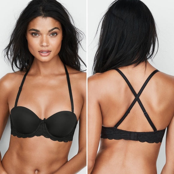 Dream Angels Multi-Way Bra from Victoria’s Secret. Lightly lined for subtle lift, underwire cups, back closure, fully adjustable, triple row of hook and eye closures with 4 settings. Removable straps allow for multiple configurations (classic, halter, one-strap, crossback or strapless) and U-shaped ballet back prevents band from riding up.
